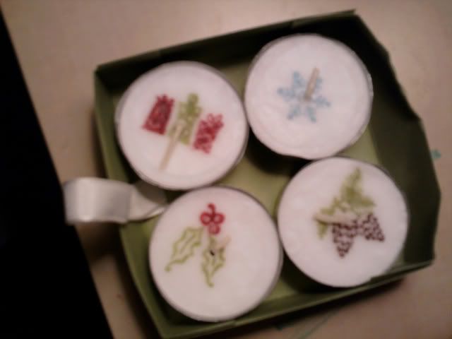 You can burn these candles. They are supercute and easy! At the demonstration we made little paper boxes to put them in (you can see mine got a little crushed on the car ride home. I gave mine to my Secret Santa at work.