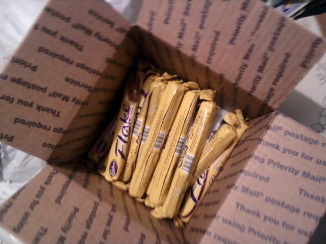 It was filled with Flake Bars a yummy candy bar I fell in love with when I was in London. They are really hard to find in the USA. Remember summer dating guy? ("I'm not ready for a relationship with anyone, oh wait, now I'm dating an undergrad" -- that guy). A specialty grocery store by his house has a spot for them in the international aisle but more often than not they are out of stock. He would look for me when he would go grocery shopping and if they happened to be in stock he has picked them up for me before.
